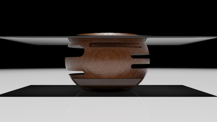 Cette table basse à base sphérique comporte un support sphérique dans lequel plusieurs ouvertures des espaces de rangements selon l'usage. La sphère, en bois ou plastique moulé, ressort sur le haut, dépassant la plaque de verre en créant un espace incurvé pouvant contenir divers objets de la vie quotidienne (clés, télécommandes, etc...).