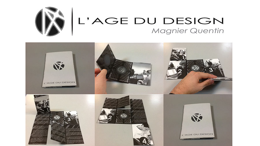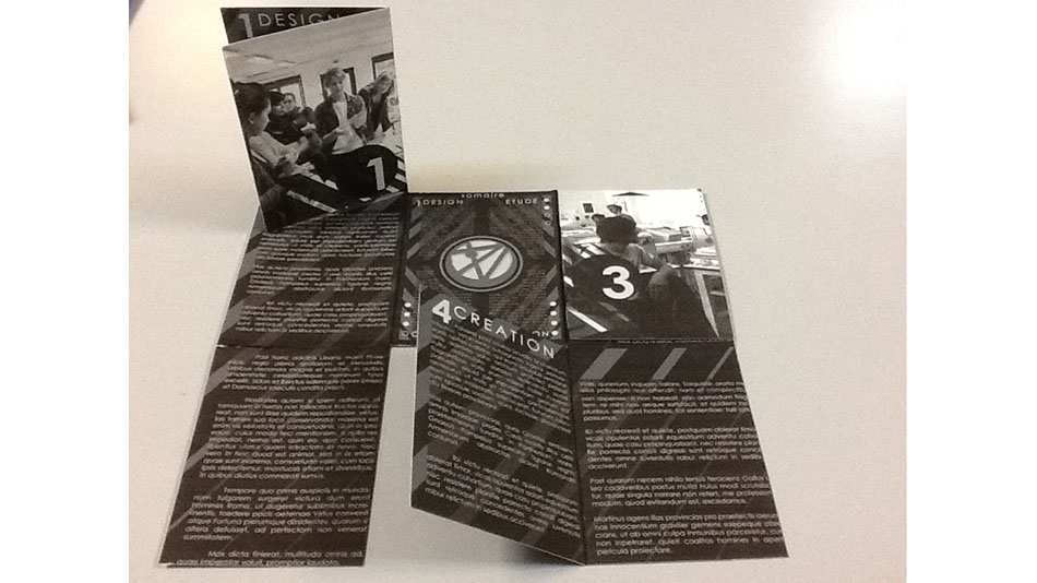 Prototype de Dépliant original récapitulant les différentes étapes de création d une section d exposition. Toute la charte Graphique repose sur des nuances de Gris et de Noir.