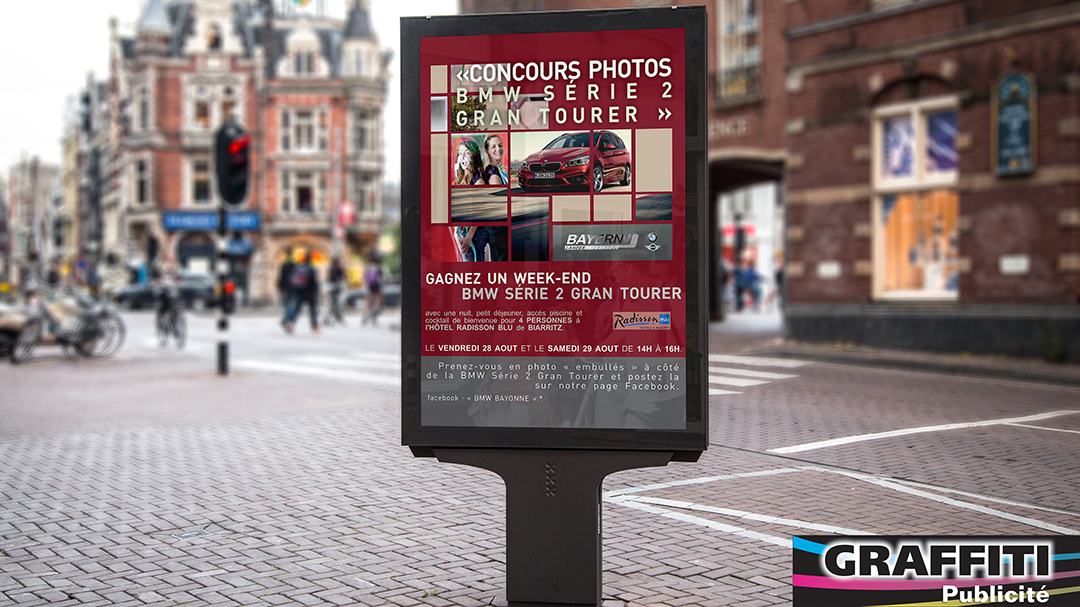 Affiche pour le concessionnaire "Bayern Auto Landes-PaysBasque", à Bayonne, dans le but de promouvoir l'évènement "photo embullé" et le nouveau BMW Série 2 Gran Tourer.
