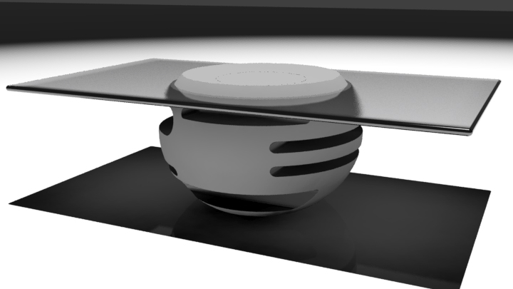 Cette table basse à base sphérique comporte un support sphérique dans lequel plusieurs ouvertures des espaces de rangements selon l'usage. La sphère, en bois ou plastique moulé, ressort sur le haut, dépassant la plaque de verre en créant un espace incurvé pouvant contenir divers objets de la vie quotidienne (clés, télécommandes, etc...).